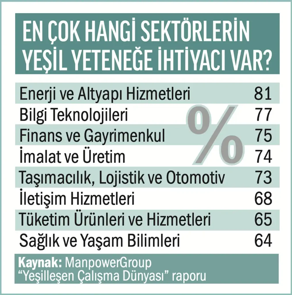 Yeşil dönüşüm, iş dünyasında köklü değişikliklere yol açıyor. Şirketler, çevresel etkilerini azaltmak ve sürdürülebilir iş modelleri oluşturmak için çeşitli stratejiler geliştirirken, bu süreçte gereken yeteneklere de büyük önem veriyor. Küresel insan kaynakları çözümleri sağlayıcılarından ManpowerGroup’un “Yeşilleşen Çalışma Dünyası” raporuna göre, işverenlerin yüzde 70’i yeşil dönüşüm için gerekli yetenekleri aktif olarak işe aldıklarını veya almayı planladıklarını ifade ediyor. Ancak, organizasyonların yüzde 94’ü, yeşil dönüşüm hedeflerine ulaşmak için gerekli yeteneklerden yoksun olduklarını belirtiyor. Bu durum, iş gücünde önemli bir boşluğu ve yeni fırsatları işaret ediyor.