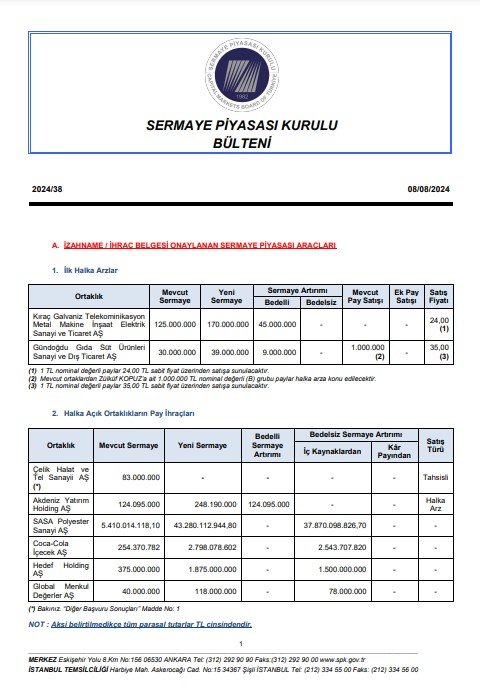 Sermaye piyasası bülteninde verdiği haberle SASA bedelsiz onaylandı.